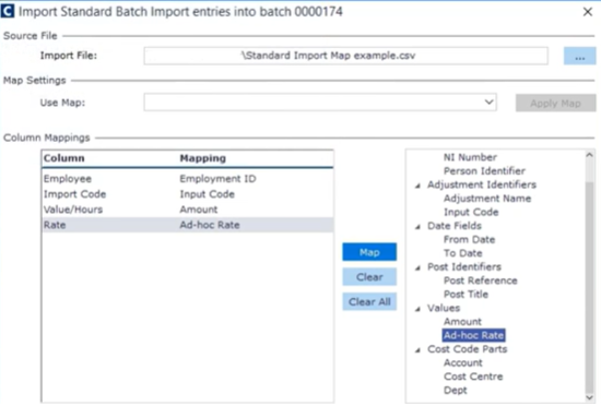 A standard import map contains all pay values in one column with a payment heading (adjustment) name or code in a separate column.