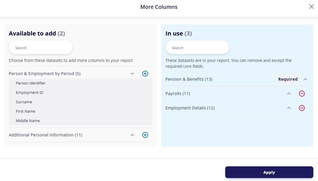 The Available to add section on the left displays all the column sets not yet available in the report. You can expand any set to view its columns. To make any set available in the column selector panel, click its add icon: