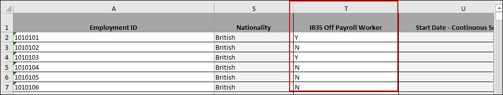 Within the import template, if the employee is an off-payroll worker, enter Y into the IR35 Off Payroll Worker column, otherwise enter N.
