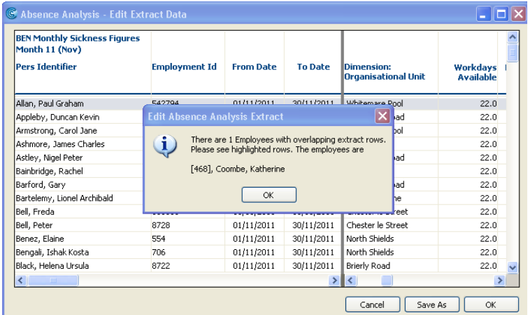 The message indicates that an employee has overlapping extract rows. This means that the employee belongs to two different ‘dimensions’ within the time period of the extract. If this message appears, find the highlighted row/s: