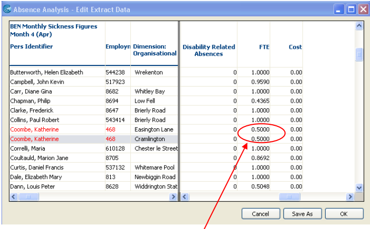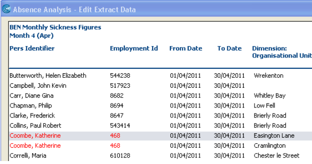 To solve this problem you can edit these rows, and either re-assign absence figures between the rows (for example, you may want to split it between the two Org Units, or delete one row, leaving the absence attributed to only one of the Org Units.