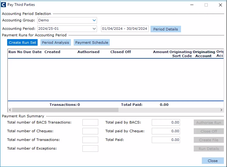 - Click the Authorise Run button, then Yes to confirm. You are returned to the Pay Third Parties window.
