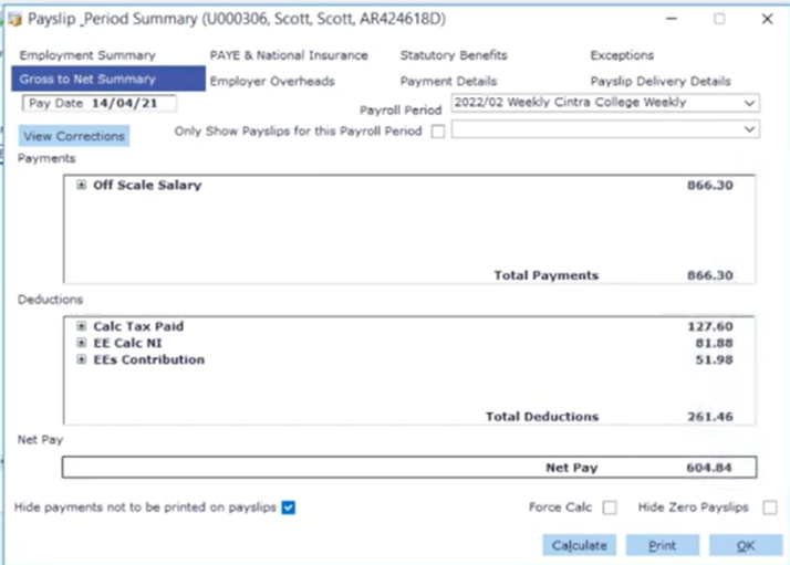 - Within the Payroll Calculation window, select the individual/employee, then click Calculate. A list of the changes will be displayed.