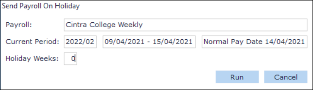 - Click the Run button. A message appears stating: Create [#] holiday weeks for [payroll name] payroll/individual.