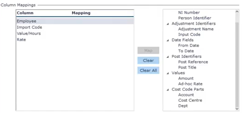 - Standard Import: A standard import map contains all pay values in one column with a payment heading (adjustment) name or code in a separate column.