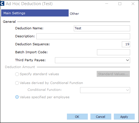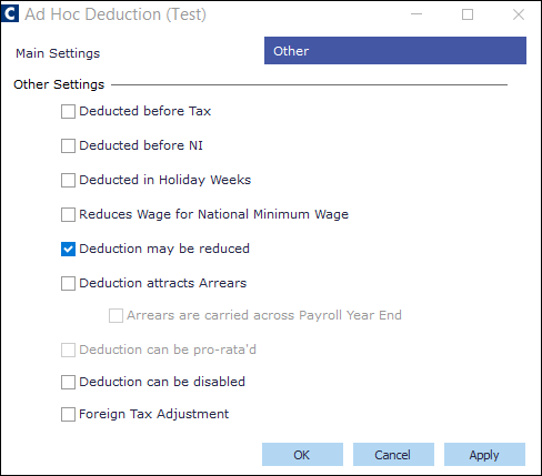 Ad Hoc Deduction | These deductions have no calculation features and are purely for periodic input of ad-hoc values such as Advances. No standard values can be attached to this heading. |