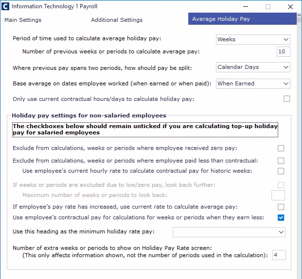 | Use employee's contractual pay for calculations for weeks or periods where they earn less: | If selected, this ensures that any week where actual pay is below contractual pay is still valued at the contractual rate for holiday pay calculations. |