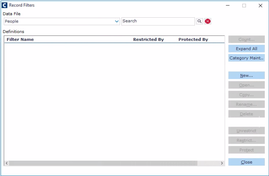 Expand All | Click this button to display the record filter definitions in all categories listed in the Definitions pane. |