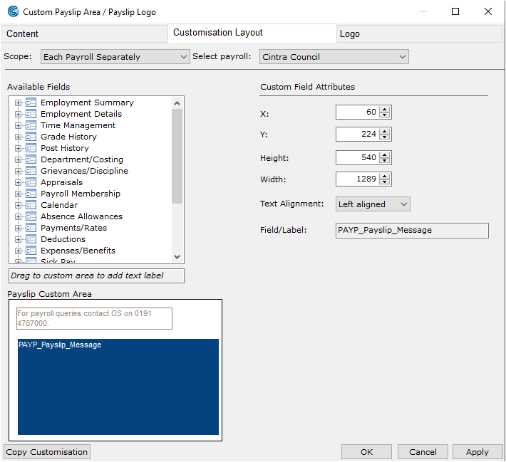 - Drag the field(s) to the desired place in the Payslip Custom Area pane.