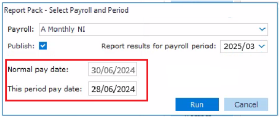 Report packs that create a payment run will have additional Normal pay date and This period pay date fields.