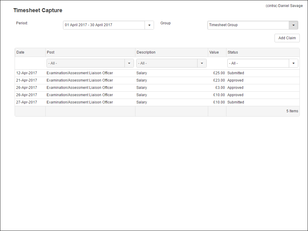 **Group | **This drop down only appears if you belong to multiple Timesheet Groups. i.e. when the you hold multiple posts and those posts belong to different Timesheet Groups. Timesheet Groups define the periodicity and date frames for claims as well as validation rules. They are configured by your system administrator in Cintra iQ Timsheets. |