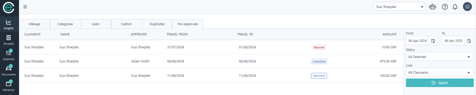 Finance and administrator user are able to view all Pre Approval requests via the Insights menu item – Pre Approval tab. Filter options are available in the right side bar.