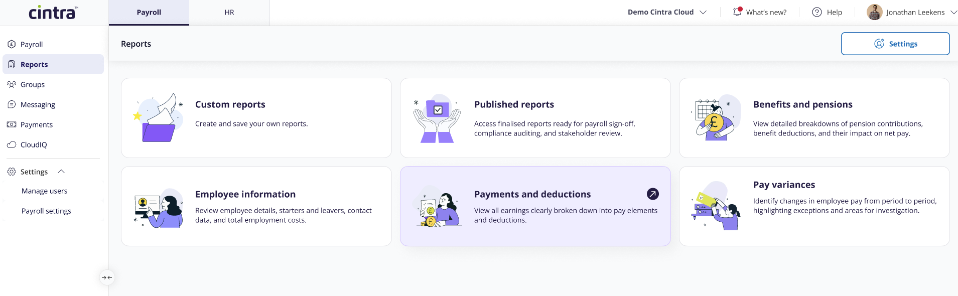 - Find reports faster: A redesigned dashboard now groups reports into six clear tiles: Custom reports, Published reports, Employee information, Payments and deductions, Benefits and pensions, and Pay variances.