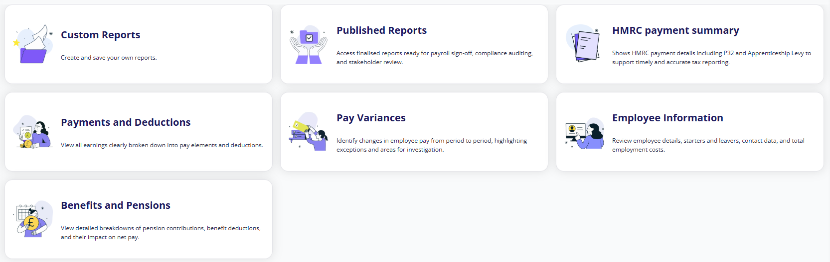 Depending on your role in Cintra People, you may not be able to access all the reports listed below. Several other reports are also available from the widgets in the Payroll summary dashboard.
