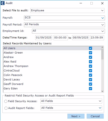 - Payroll: You can either audit on a specific payroll or ALL payrolls