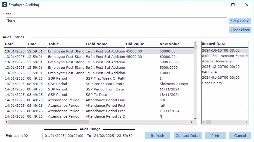 When you select any audit entry, the Record Data section will display more information about the data change. You can also view further information by clicking Context Detail.