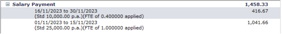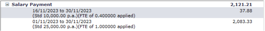 In contrast, for Old plus new daily rates method, the same change will show as two segments broken down by effective date of the change. You can see below that one part of salary is paid from 1st November until 15th November and the new salary is paid from 16th November until end of the month.