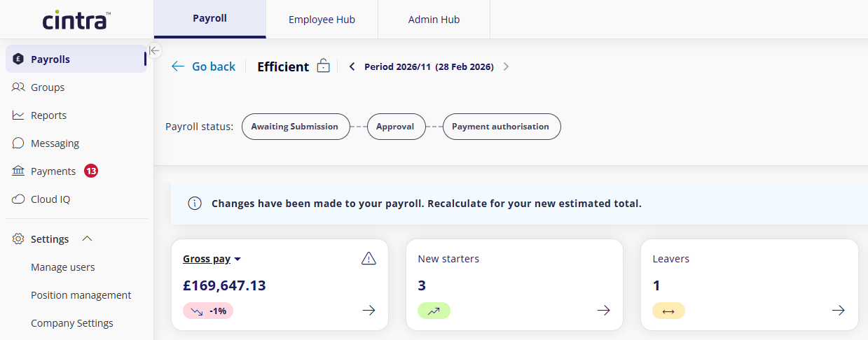 The tiles in the centre of the payroll display how many employees in the current payroll period are new starters or leavers.