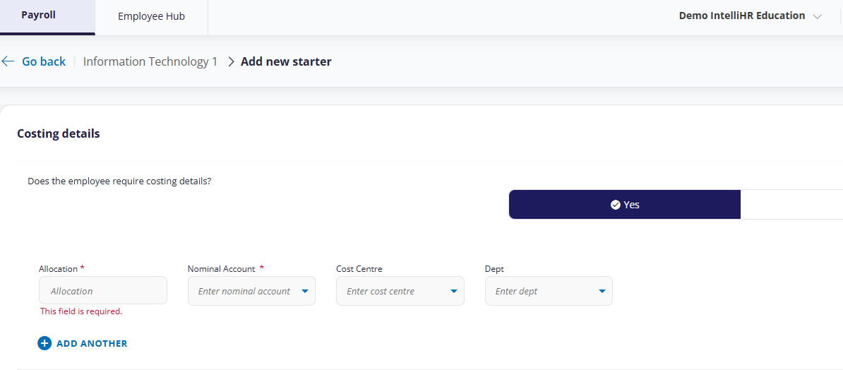 Note: The costing details fields within your organisation may differ