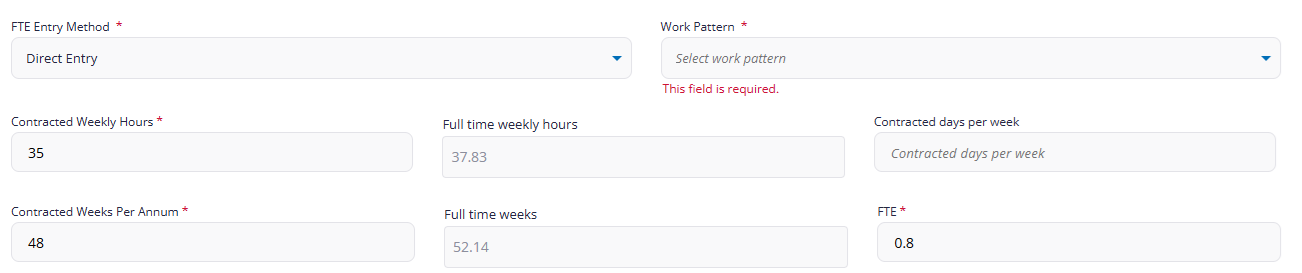 - FTE Entry Method: If the employee doesn't follow standard working hours and you need to enter their FTE manually, select Direct entry, otherwise select Based upon contract hours.