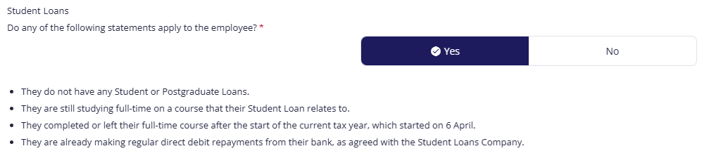 - If NONE of these statements apply, select No, then choose which type(s) of student loans the employee has.