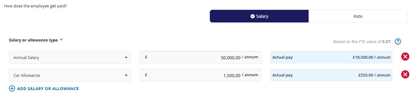 - Enter how much money the employee receives for the salary / allowance per annum. The field on the right will calculate the actual pay, based on the FTE.