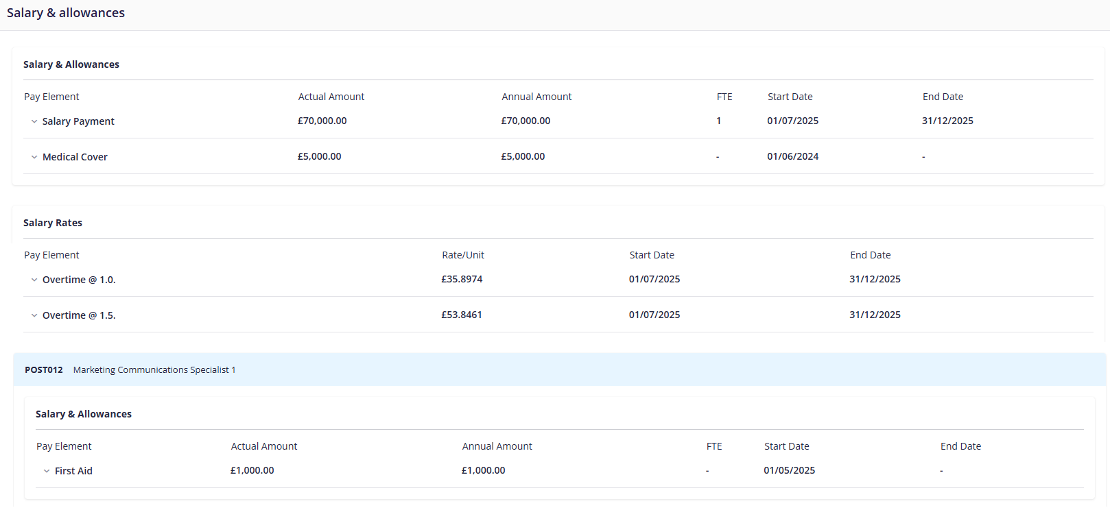 - The lower half displays all the positions assigned to the employee with all its associated payments. This section will only be visible to organisations that use positions.