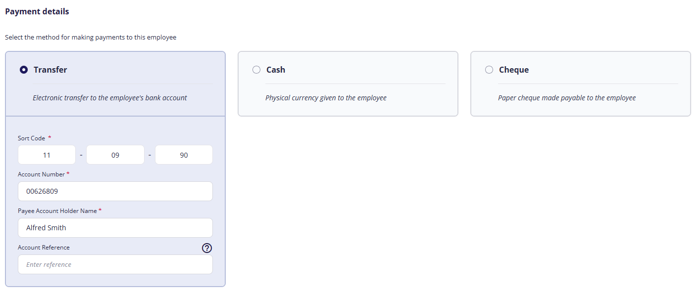 2. Enter the employee's sort code, account number, and account holder name.