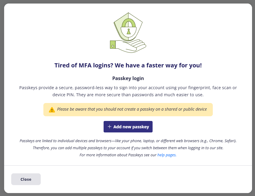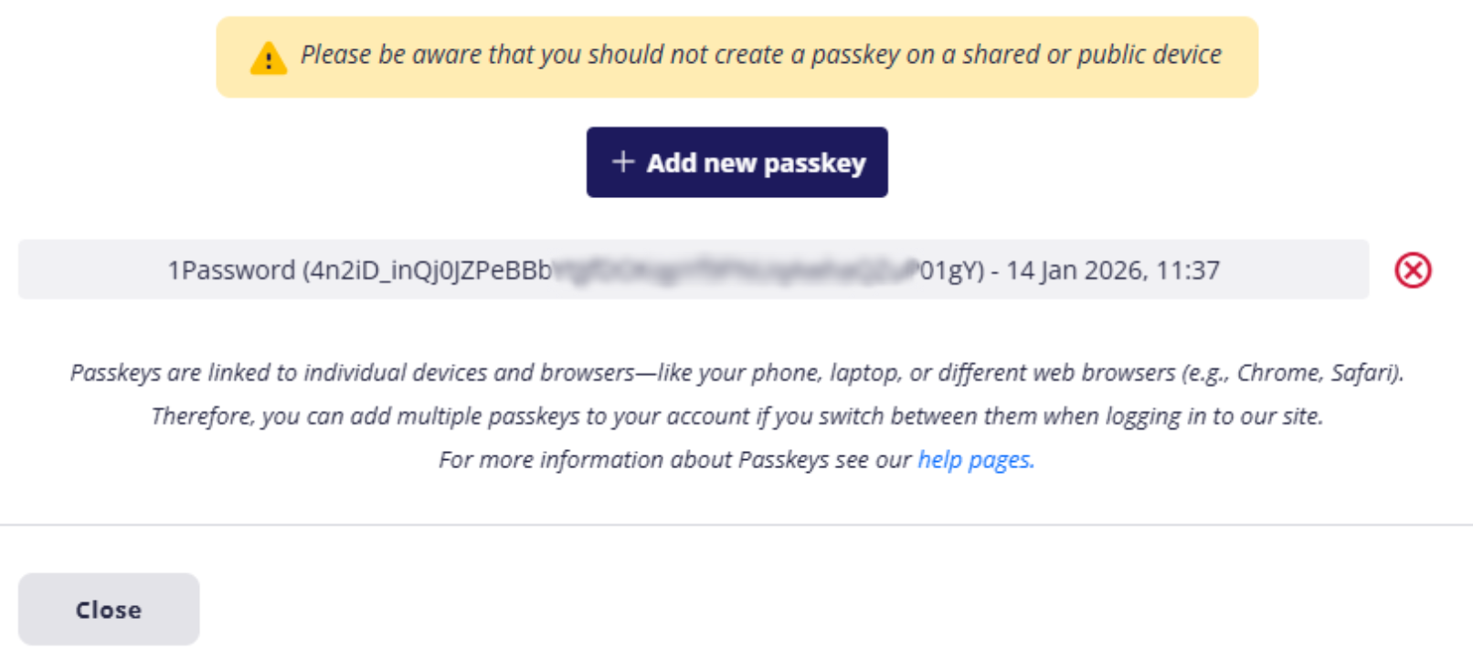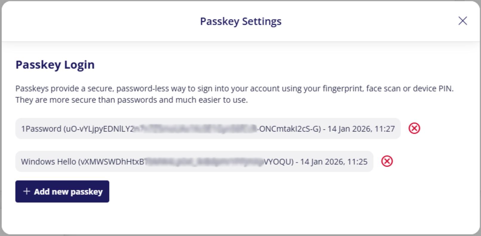 - The Passkey Settings screen will display a list of all passkeys you have already set up. If you use more than one device to access the system, you will need to set up passkeys for each device.