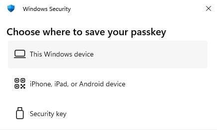When you click Add new passkey, you will be prompted to set up a passkey. The procedure will differ, depending on whether you are using a computer or mobile device, and whether you have use any password manager. However, this is a typical process for a Windows PC: