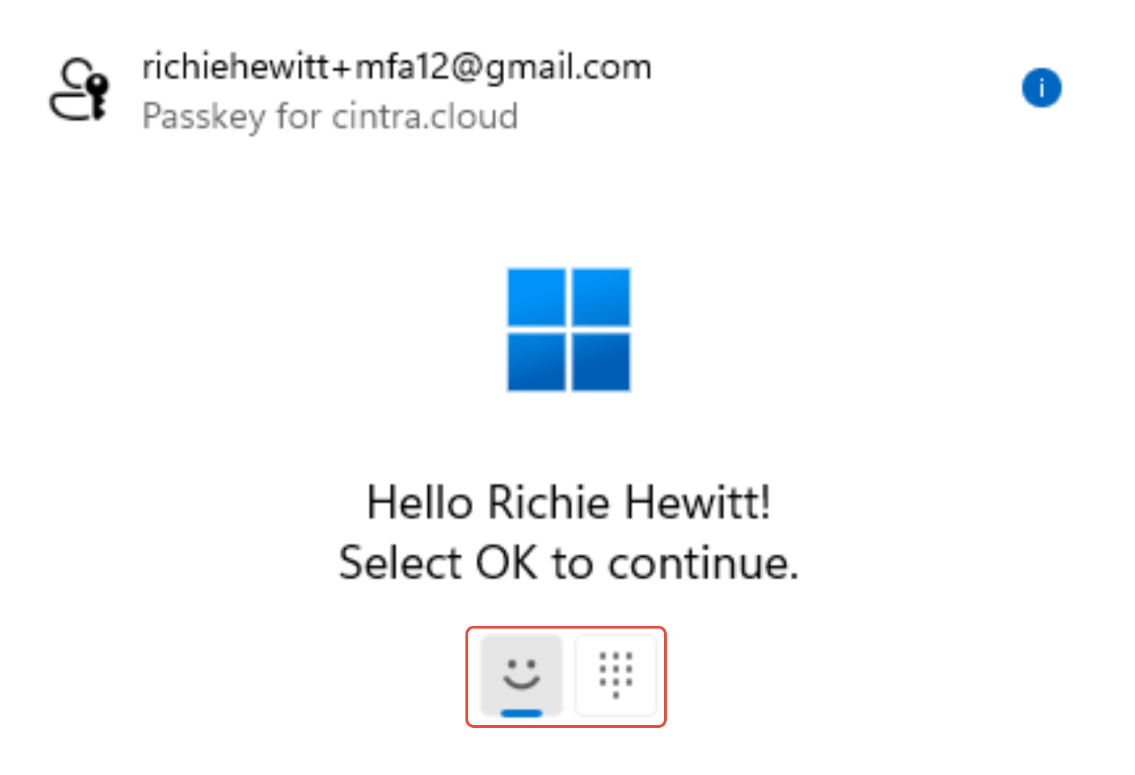 Depending on how you set up your passkey, you may be required to enter a PIN, put your face in front of the camera, or simply click OK.