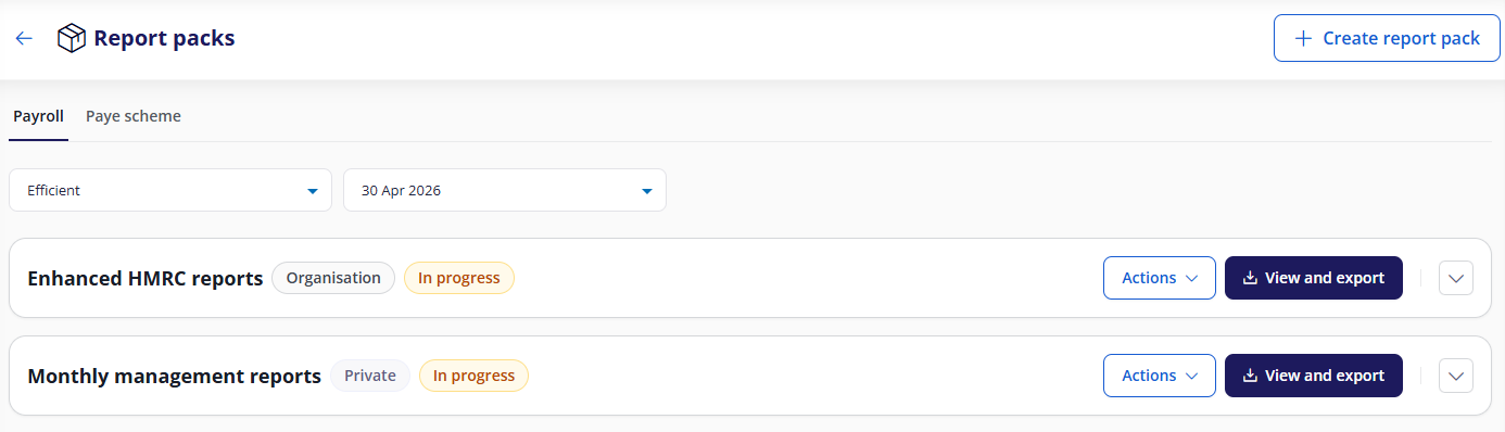 - Each pack displays the current status (e.g. in progress, approved) of the selected payroll and period.